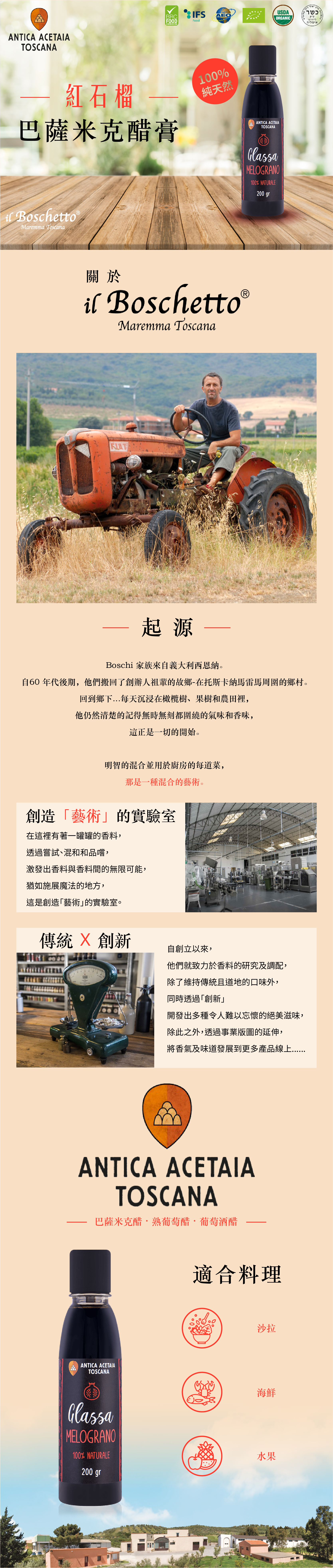 享譽國際的葡萄酒醋,無論口感與品質,可以說最棒之一的就是來自義大利的托斯坎納十足的果香味葡萄酒醋莫屬了。而這裡的熟葡萄酒醋早在文藝復興時期就是權貴們的首選。Antica Acetaia Toscana是百年家族品牌,傳統橡木桶葡萄酒醋釀造為基底,果香濃厚十足,添加上黃金比例之天然果汁熬煮,讓Antica Acetaia Toscana熟葡萄醋及巴薩米克醋膏得到最完美的最佳口感。適合搭配任何料理:肉類、海鮮、 蔬食或是醃製物......等,完全征服您的味蕾!