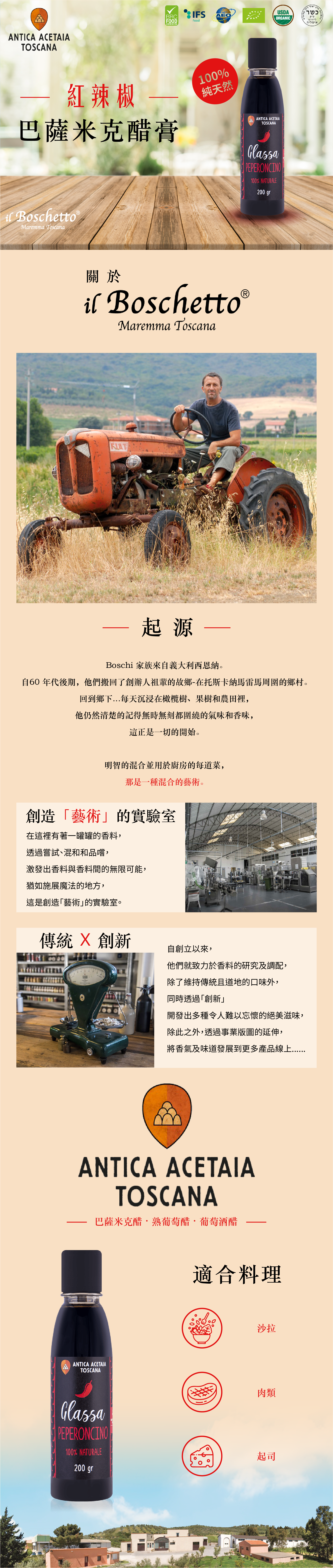 享譽國際的葡萄酒醋,無論口感與品質,可以說最棒之一的就是來自義大利的托斯坎納十足的果香味葡萄酒醋莫屬了。而這裡的熟葡萄酒醋早在文藝復興時期就是權貴們的首選。Antica Acetaia Toscana是百年家族品牌,傳統橡木桶葡萄酒醋釀造為基底,果香濃厚十足,添加上黃金比例之天然果汁熬煮,讓Antica Acetaia Toscana熟葡萄醋及巴薩米克醋膏得到最完美的最佳口感。適合搭配任何料理:肉類、海鮮、 蔬食或是醃製物......等,完全征服您的味蕾!